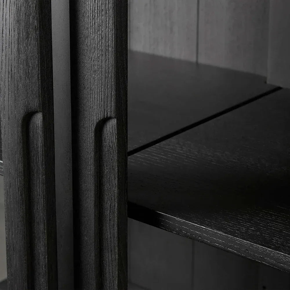 Designed for both storage and display, the interior features a fixed middle shelf along with two adjustable and removable shelves—providing flexible arrangements for chinaware, books, decorative objects, or daily essentials. The sliding glass doors are fitted with discreet finger pulls, maintaining a streamlined appearance while ensuring easy operation.