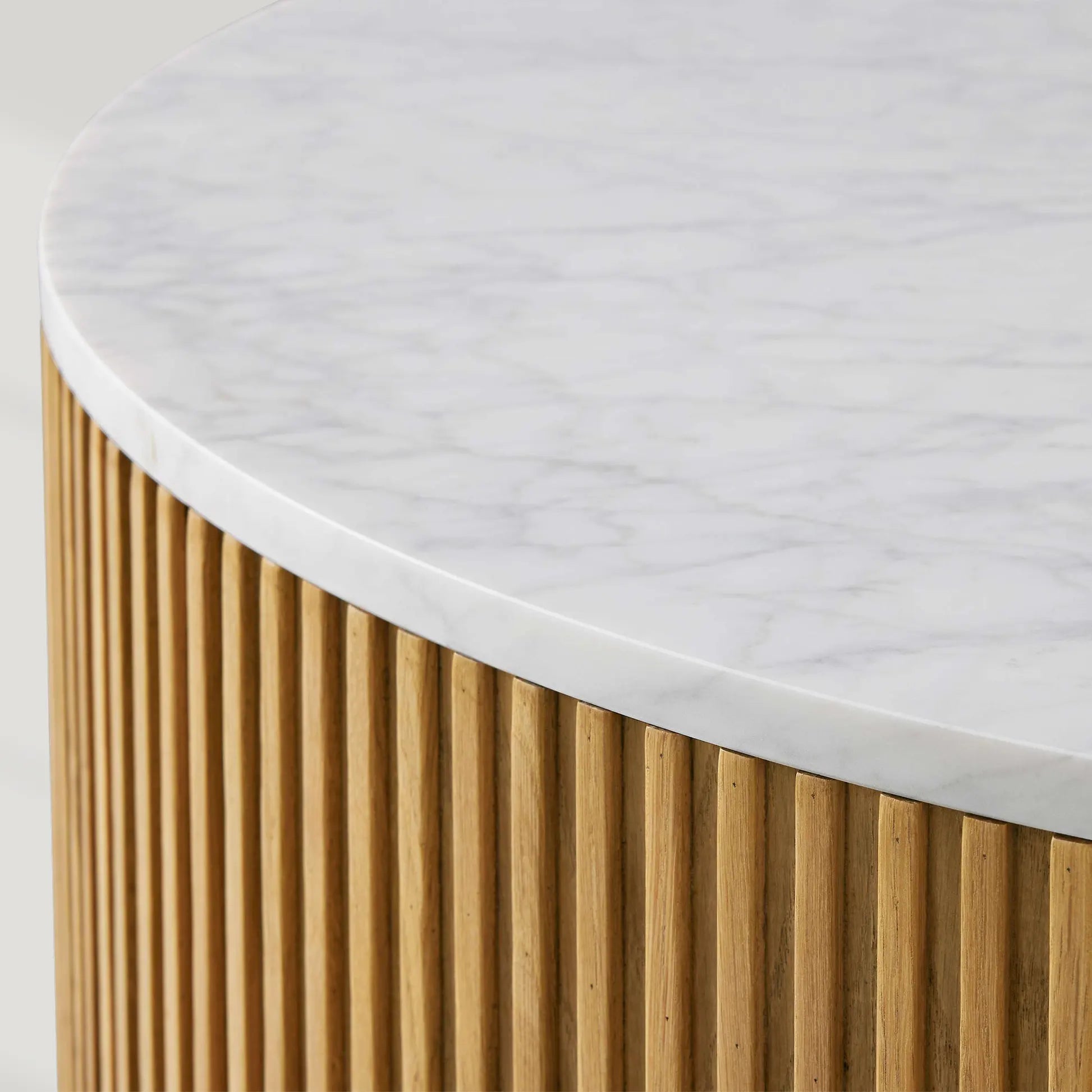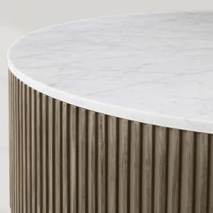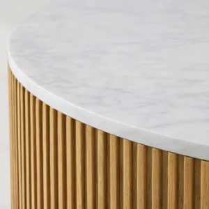 Elevate your living space with the Finnley Round Coffee Table, a masterful blend of natural materials and artisanal craftsmanship. This piece unites hand-finished Finnish pine, elegant stone tops, and delicate reeded oak detailing, all resting upon refined light brass plinth bases. The harmonious combination of textures and finishes creates a versatile centerpiece that complements both modern and transitional interiors.