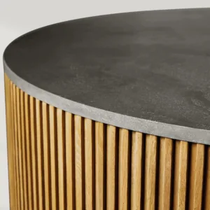 – Design: Mixed-material aesthetic with sculptural plinth base