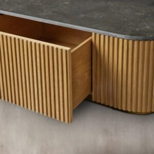 The Finnley Storage Coffee Table artfully blends natural materials and refined detailing to create a functional yet striking centerpiece for your living space. Crafted from hand‑finished Finnish pine or white oak, this table features an elegant stone top, a slender brass‑finished plinth base, and delicate reeded wood accents that together evoke a look of modern sophistication with organic warmth.
