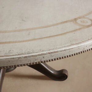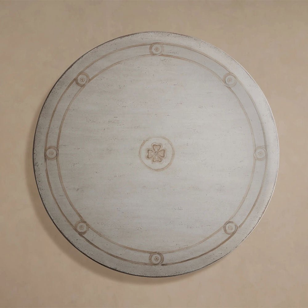 Finished entirely by hand in soft Antique White, the table is encircled by a geometric motif hand-painted in Antique Grey, lending a refined and timeless elegance. Each piece undergoes a meticulous, multi-day process of layering stains, paints, and lacquers—all applied with artisanal brushwork to achieve a gracefully distressed character.