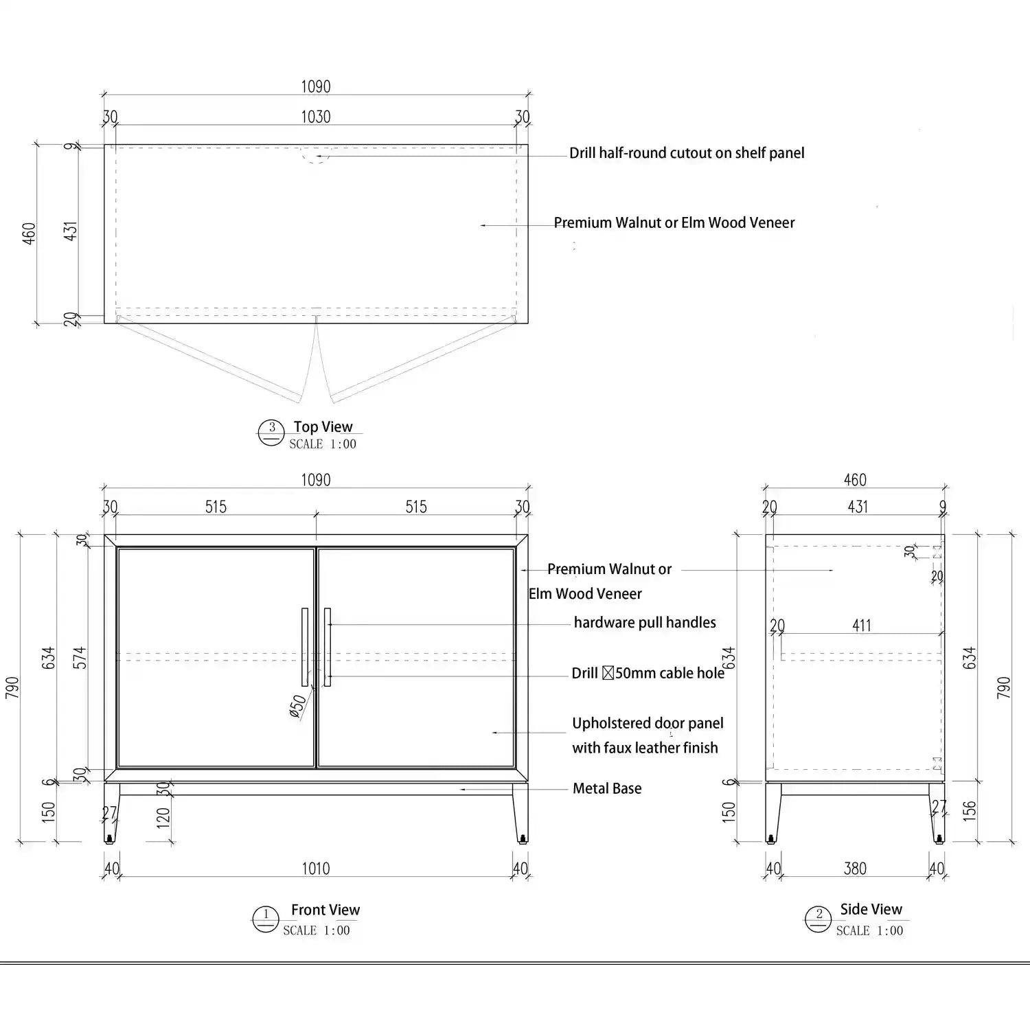 – Solid wood frame with walnut or elm wood veneers
