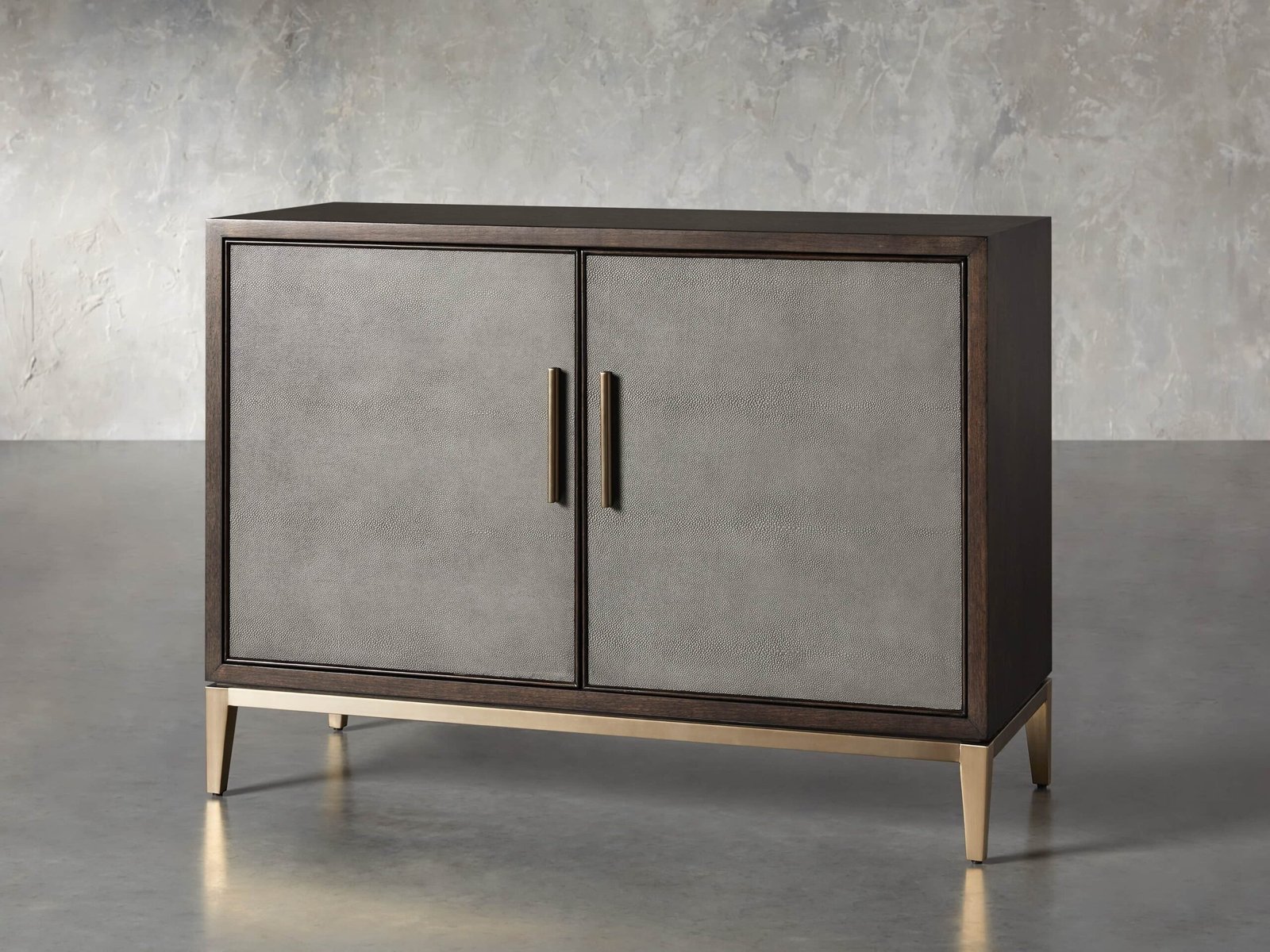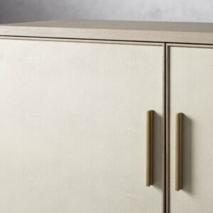 Blending timeless craftsmanship with clean, modern aesthetics, the Malone Two-Door Cabinet offers a refined storage solution for any living space. Artisan-crafted from solid wood—available in oak or parawood based on your finish selection—and finished with elegant walnut or elm wood veneers, this piece brings durability and sophistication together. The addition of reconstituted leather insets with embossed shagreen texture and subtle metallic accents elevates its design, while adjustable interior shelves allow you to customize the storage to suit your needs.