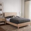 This platform bed is designed to support a standard mattress and includes a built-in storage drawer at the footboard. The drawer front is padded and upholstered, and it operates on ball bearing metal runners for smooth opening and closing. The frame is constructed from solid wood and engineered hardwood, with a slat-roll support system to provide mattress support. A box spring or foundation is required for use. The bed frame is compatible with adjustable bases that allow full clearance. It is intended for residential bedroom use and standard sleeping arrangements. Care includes dusting with a soft, dry cloth, avoiding household cleaners and abrasives, and limiting exposure to direct sunlight and extreme temperatures. Periodic checks of hardware connections are recommended.